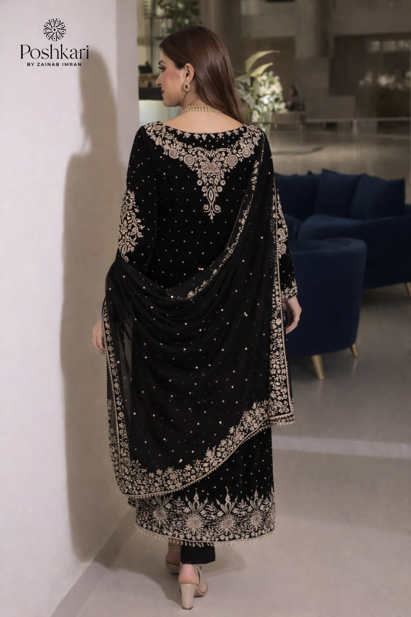 Elevate your wardrobe with Poshkari's exquisite luxury velvet collection, featuring three unstitched pieces in sophisticated black. Each component showcases intricate embroidery craftsmanship, blending traditional artistry with contemporary elegance. The premium velvet fabric offers a sumptuous texture and refined drape, perfect for creating bespoke formal wear or festive ensembles. This versatile collection allows you to customize the fit and style to your preferences, ensuring a truly personalized garment. Ideal for special occasions, weddings, and celebrations where timeless luxury meets individual expression.